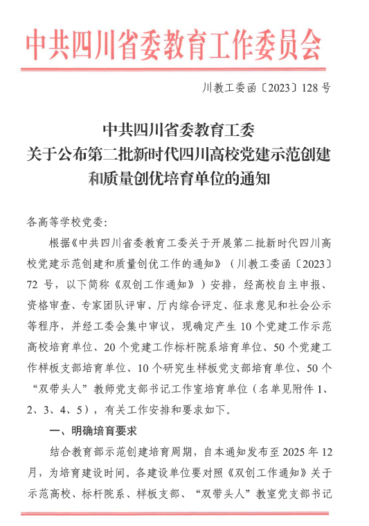 2023年7月,四川省委教育工委组织开展了第二批新时代四川高校党建示范创建和质量创优(简称“双创”)工作。近日,经资格审查、专家团队评审、厅内综合评定和征求意见、工委会集中审议、结果公示等环节,宜宾学院质量与检验检测学部质量与标准化学院教师党支部立项为第二批“四川高校党建工作样板支部”培育单位,国际教育学部教师党支部赵亚玲同志工作室立项为第二批四川高校“双带头人”教师党支部书记工作室培育单位。