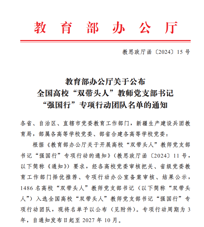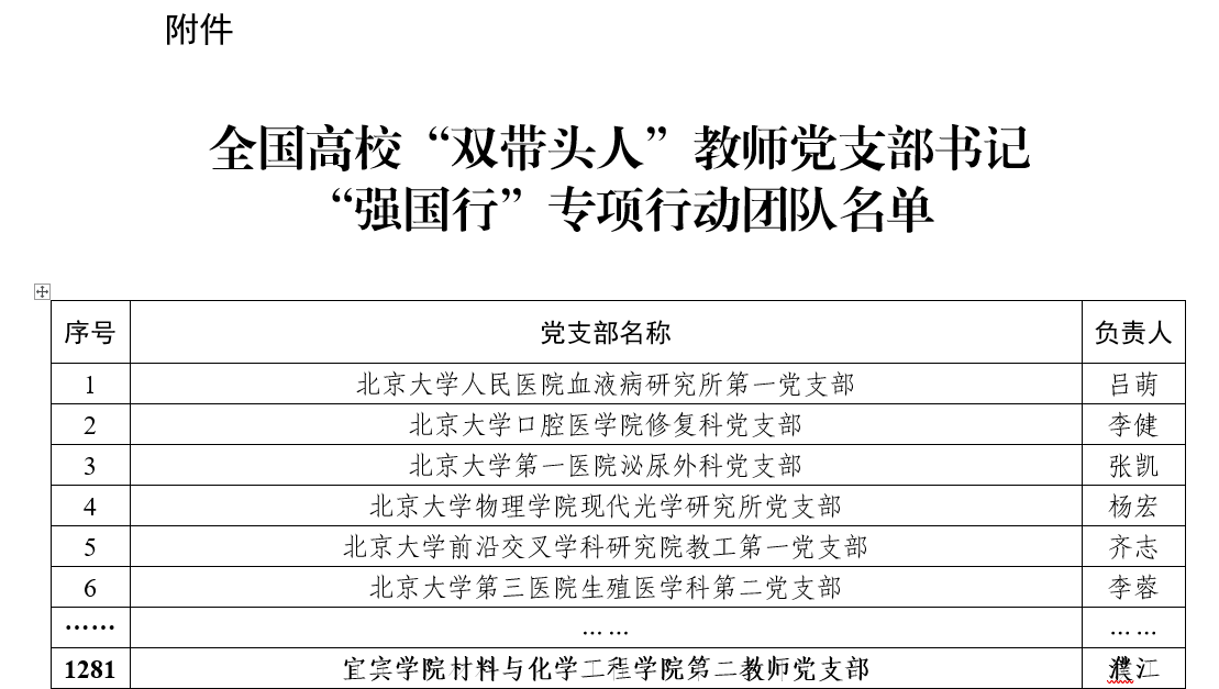 近日,教育部办公厅印发了《关于公布全国高校“双带头人”教师党支部书记“强国行”专项行动团队名单的通知》,我校材料与化学工程学院第二教师党支部入选。