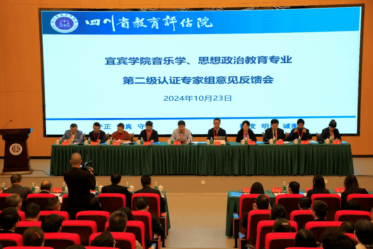 10月23日,宜宾学院音乐学、思想政治教育专业第二级认证专家组意见反馈会在求实会堂阶梯报告厅召开。联合认证组组长、音乐学专业组组长、安徽科技学院原副校长郭亮教授,思想政治教育专业组组长、江西师范大学原科学技术学院院长彭隆辉教授专家组一行,宜宾学院校领导、党委常委出席会议。相关职能部门负责人,二级学院(部)党政主要负责人以及分管教学的副院(部)长,音乐与表演学院、马克思主义学院党政主要负责人以及分管教学的副院(部)长、专业全体教师参会。郭亮教授主持会议。