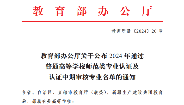 近日,教育部办公厅发布了《关于公布2024年通过普通高等学校师范类专业认证及认证中期审核专业名单的通知》(教师厅函〔2024〕20号)。宜宾学院小学教育、数学与应用数学、化学、体育教育、物理学、英语、汉语言文学7个专业顺利通过师范类专业第二级认证,有效期六年,自2024年10月起至2030年9月止。