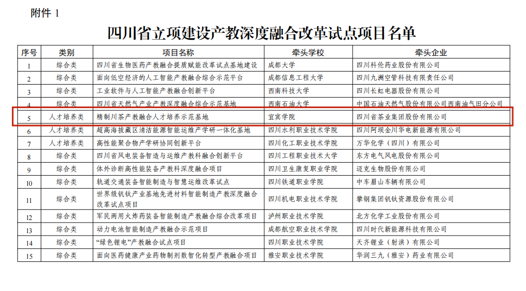 近日,四川省财政厅、四川省教育厅、四川省经济和信息化厅、四川省科学技术厅发文公布了“2024年四川省立项建设产教深度融合改革试点项目名单”,我校“精制川茶产教融合人才培养示范基地”项目获批立项人才培养类项目。该项目为学校与四川省茶业集团有限公司联合申报建设,标志着学校在产教深度融合方面取得了重要突破。
