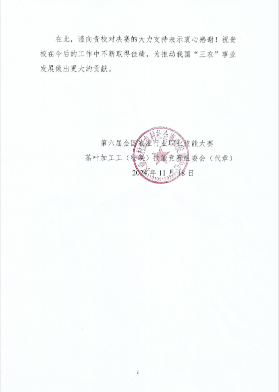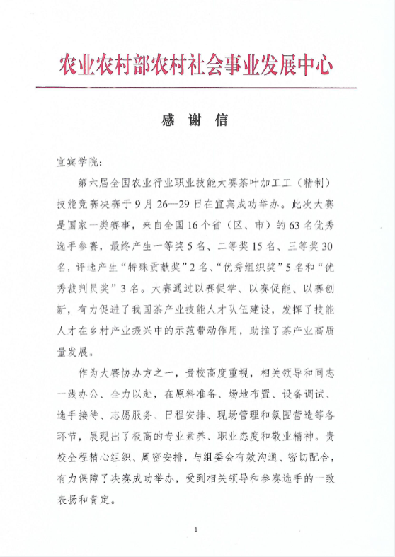 近日,农业农村部农村社会事业发展中心向我校发来感谢信,衷心感谢我校对第六届全国农业行业职业技能大赛茶叶加工工(精制)技能竞赛决赛的大力支持。