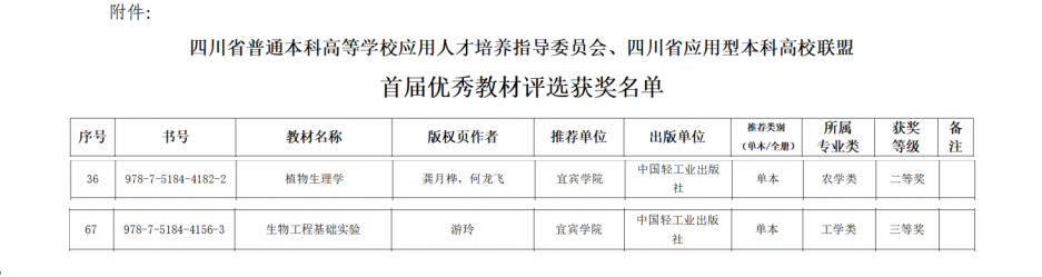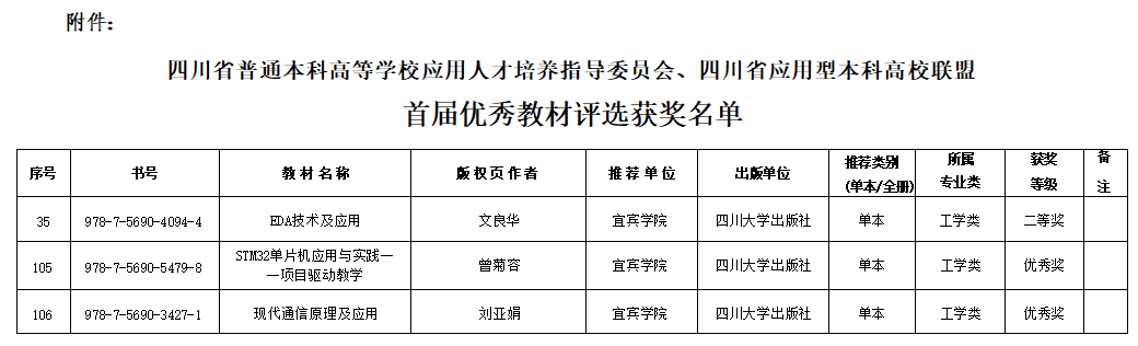 近日,四川省普通本科高等学校应用人才培养指导委员会、四川省应用型本科高校联盟公布了入选首届优秀教材评选获奖名单,农林与食品工程学部龚月桦教授及其教学团队编写的《植物生理学》教材和游玲教授及其教学团队编写的《生物工程基础实验》教材,分别荣获二等奖和三等奖;电子信息工程学院文良华主编的教材《EDA技术及应用》荣获二等奖,曾菊容主编的教材《STM32单片机应用与实践—项目驱动教学》和刘亚娟主编的教材《现代通信原理及应用》分别荣获优秀奖。
