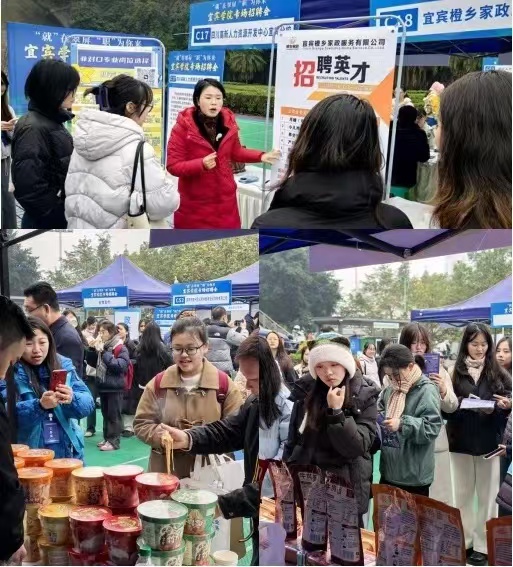 招聘会现场人头攒动,求职学生积极向用人单位投递自己的简历,与各用人单位交流自身情况,详细了解各用人单位的基本情况、企业文化、薪资待遇、发展前景等。为进一步提升毕业生面试技巧和求职技能,本次招聘会设有职业指导专区,为毕业生提供职业规划、简历修改、面试指导、政策讲解等多项服务,为毕业生求职就业赋能。此外,招聘会现场专门设立翠屏特色专区,宜职院燃面产业发展公司、有正农业、李庄张黄粑等企业在开展招聘的同时还展销农特产品,邀请求职学生品尝,以食为媒,传播翠屏美食文化,吸引学生留翠就业。据统计,本次招聘会累计投递简历800余份,达成初步就业意向305人。