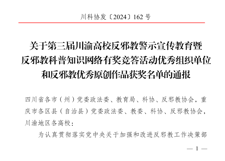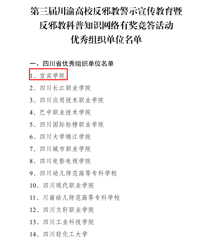 近日,第三届川渝高校反邪教警示宣传教育暨反邪教科普知识网络有奖竞答活动结果揭晓,宜宾学院脱颖而出,荣获“四川省优秀组织单位”称号,并有5项作品在反邪教优秀原创作品评选中获奖,展现了学校在反邪教教育方面的突出成绩。