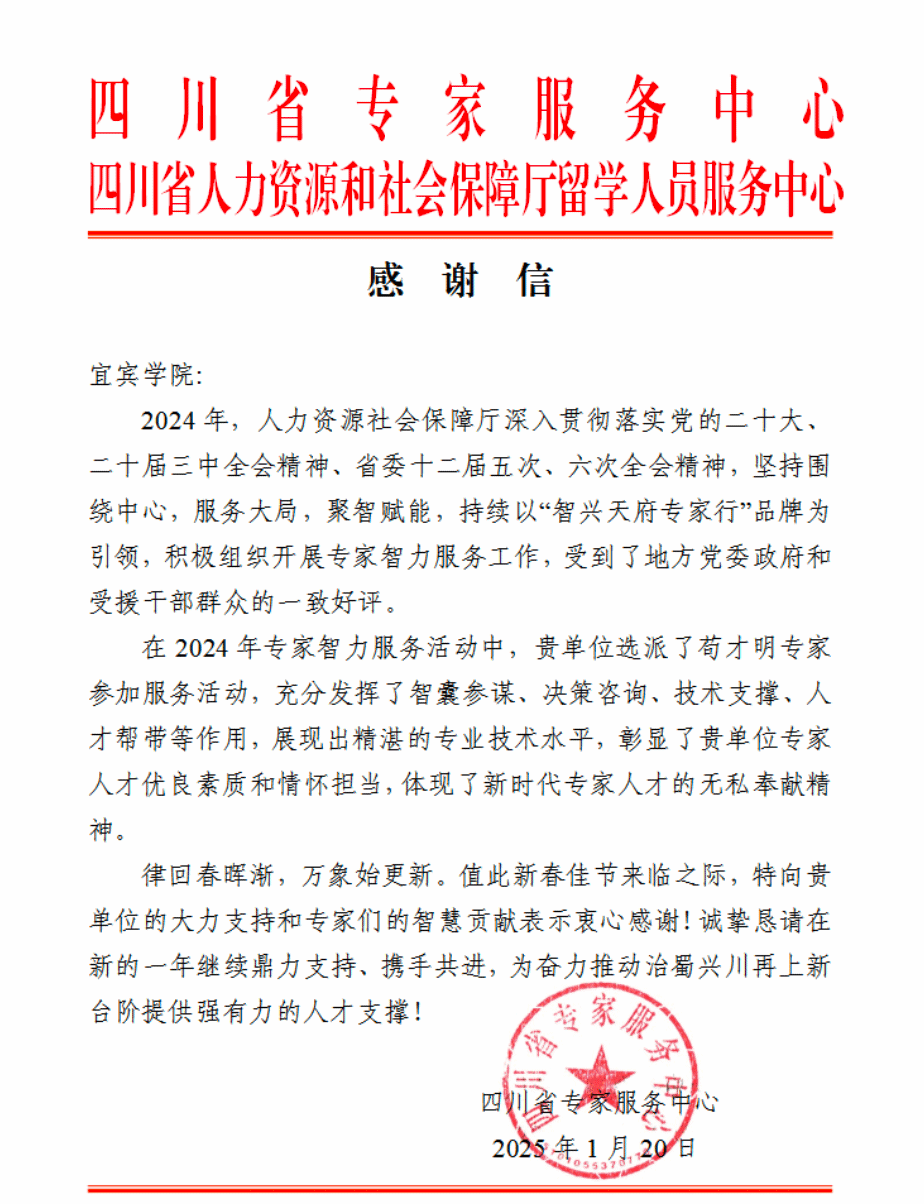近日,宜宾学院收到四川省专家服务中心、四川省人力资源和社会保障厅留学人员服务中心的感谢信,信中对我校2024年积极组织开展专家智力服务工作给予高度肯定,对我校专家表示感谢。