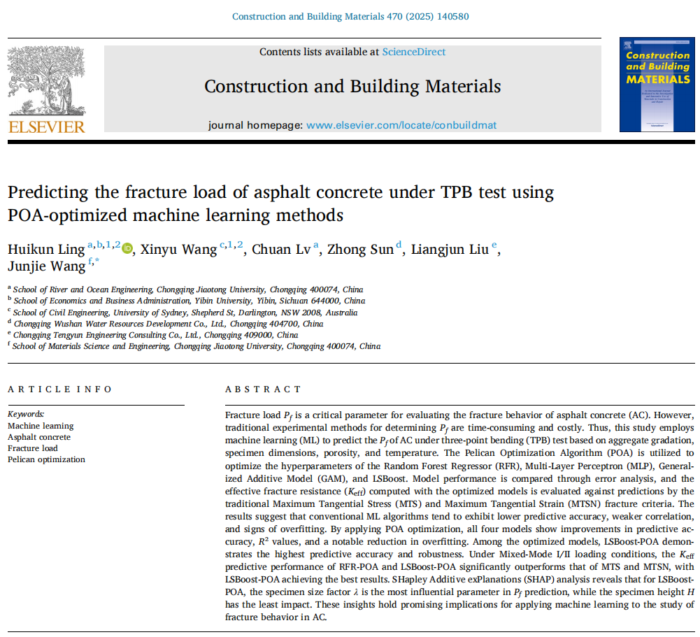 近日,我校凌会坤博士与重庆交通大学以及悉尼大学合作,在国际知名期刊《Construction and Building Materials》(《建造与建筑材料》)上发表题为“Predicting the fracture load of asphalt concrete under TPB test using POA-optimized machine learning methods”(基于POA算法优化的机器学习方法对沥青混凝土三点弯曲断裂荷载的预测)的研究论文。该论文成功将机器学习算法与优化算法结合,为沥青混凝土断裂性能预测提供了创新解决方案,标志我校在机器学习的工程应用研究水平持续提升。凌会坤博士为该论文的第一作者,宜宾学院为第二署名单位。据悉,该期刊2024年最新影响因子为7.0,是中科院工程技术大类一区Top期刊,位于JCR一区。