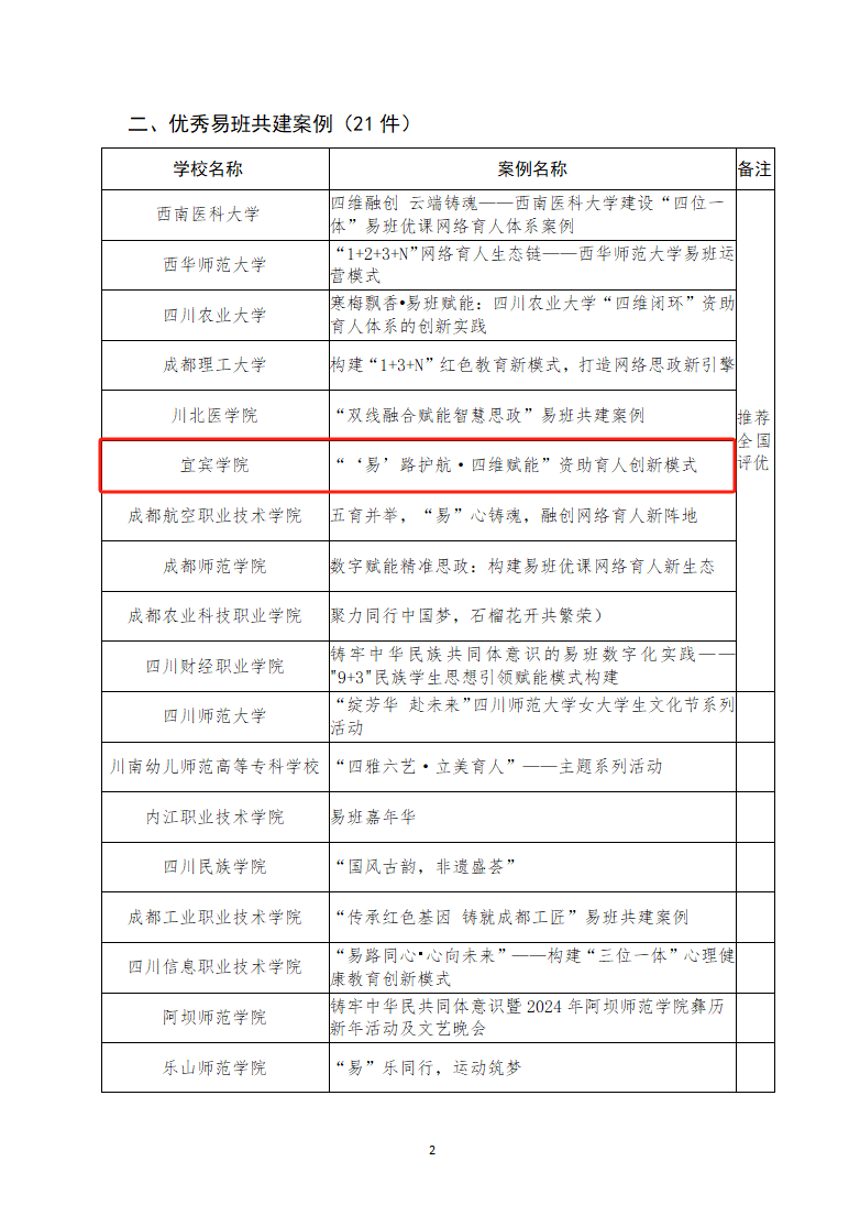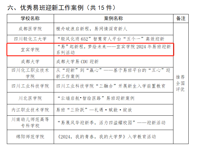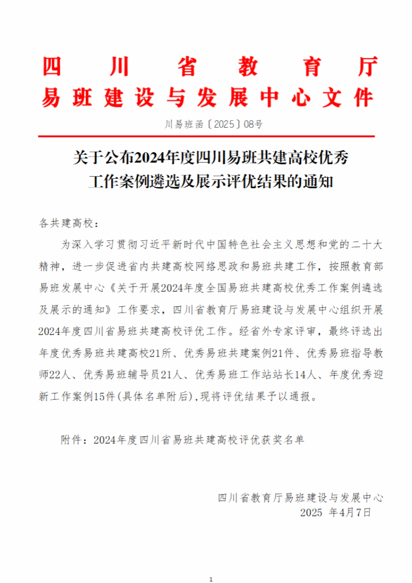 4月7日,四川省教育厅易班建设与发展中心发布《关于公布2024年度四川易班共建高校优秀工作案例遴选及展示评优结果的通知》,我校荣获优秀易班共建案例、优秀易班迎新工作案例和优秀易班辅导员三项荣誉,三项获奖项目将被省教厅推荐参加全国评优,这是我校首次获得省易班优秀。