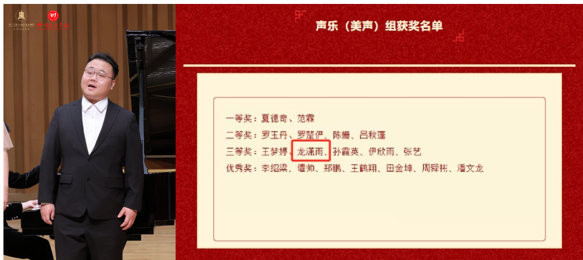 近日,第十五届中国音乐金钟奖四川省选拔赛落下帷幕,本届选拔赛分为成都、南充、乐山三大赛区,来自全省21个市州的2000余名青年音乐才俊同台竞技。比赛涵盖声乐(美声、民族)、器乐(钢琴、古筝、民族弹拨乐、管乐铜管)等项目,历经初赛、复赛、决赛三轮激烈角逐。我院青年教师龙潇雨取得声乐(美声)组三等奖并获推参加全国比赛资格,谢林琳取得民族弹拨乐组优秀奖。