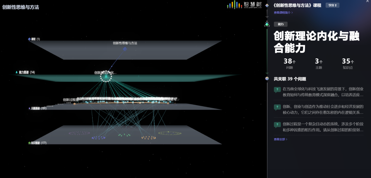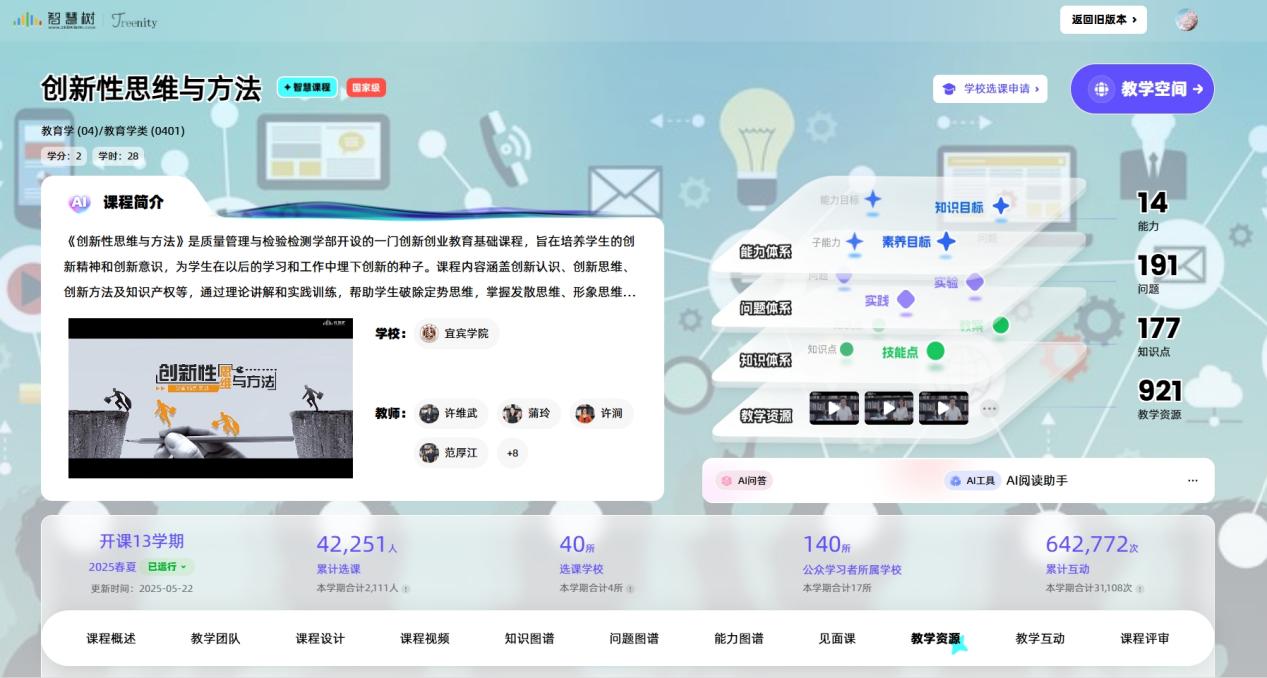 《创新思维与方法》智慧课程深度融合AI技术与创新教育,构建了“能力-问题-知识-资源”四维图谱,旨在打破传统思维定式,赋能学生以创新思维解决复杂问题的能力。此外,课程深度整合多模态交互指令与17余款智能教学工具,系统化重构"师-生-机"三元协同教学体系。