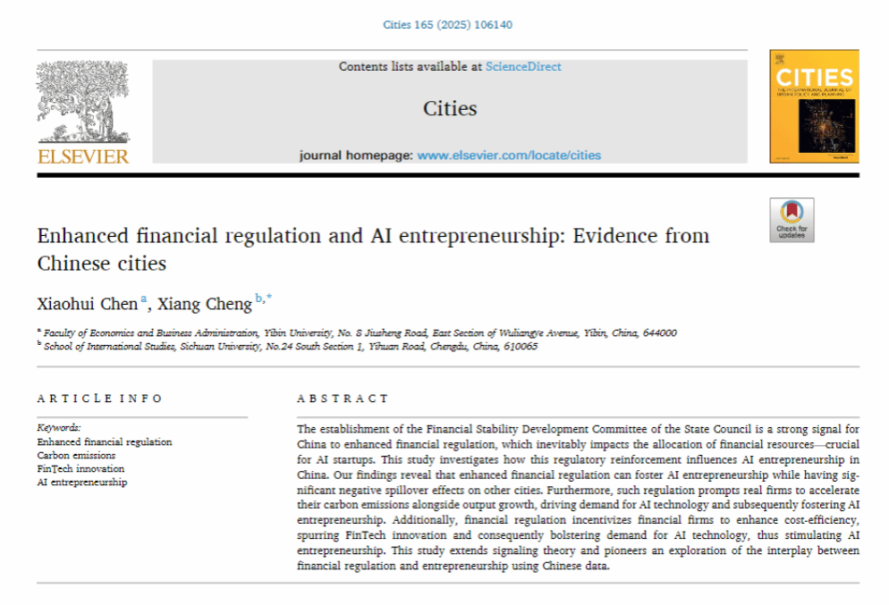 近日,宜宾学院经管学院传来喜讯,陈小辉教授在学术研究领域取得重大突破,其研究成果“Enhanced financial regulation and AI entrepreneurship: Evidence from Chinese cities(强化金融监管与AI创业:来自中国城市的证据)”成功发表于国际顶级学术期刊《Cities》(《城市》)。这一成果不仅彰显了陈小辉教授卓越的学术研究能力,更为宜宾学院数字经济学科点建设注入了强劲动力。《Cities》期刊是SSCI检索期刊,属于中科院一区TOP期刊,影响因子为6.0,在全球城市研究类SSCI期刊中排名前三。