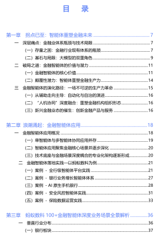 报告指出,金融行业正经历从数字化向智能化的深刻转型,生成式人工智能及大模型成为这一变革的核心驱动力。然而,大模型在金融场景应用中存在局限性,如缺乏自主感知与决策执行能力、“幻觉”问题等。金融智能体应运而生,它通过“感知-推理-规划-执行-进化” 的闭环机制,将大模型的认知能力转化为具体金融业务行动,有效打破流程壁垒,实现端到端自动化和实时响应,显著提升金融业务的效率和智能化水平。目前,我国金融智能体的应用呈现出单智能体与多智能体协同并存的态势,主要聚焦于客服、风控等核心场景,并不断深化。技术底座与金融场景深度融合,形成了专业化架构。蚂蚁数科立足“场景驱动、价值创造”,其金融智能体产品已经在银行、保险、证券等金融细分行业落地实践,覆盖财富管理、营销增长、信贷管理、风险防控等核心业务场景,真正实现“天天用、时时用”的规模化应用。