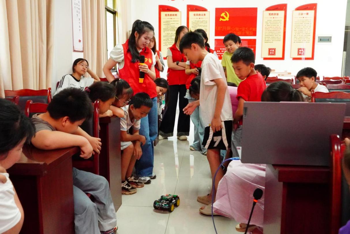 聚焦科技赋能,培育创新思维。团队开展“科技创新”实践活动,围绕人工智能、编程、趣味科创实验等方向,通过AI大模型互动体验、智能小车编程教学等丰富形式,为基层科技创新发展贡献力量,将前沿科技知识巧妙融入趣味教学,开展科学实验课程,助力提升学生的科学素养。