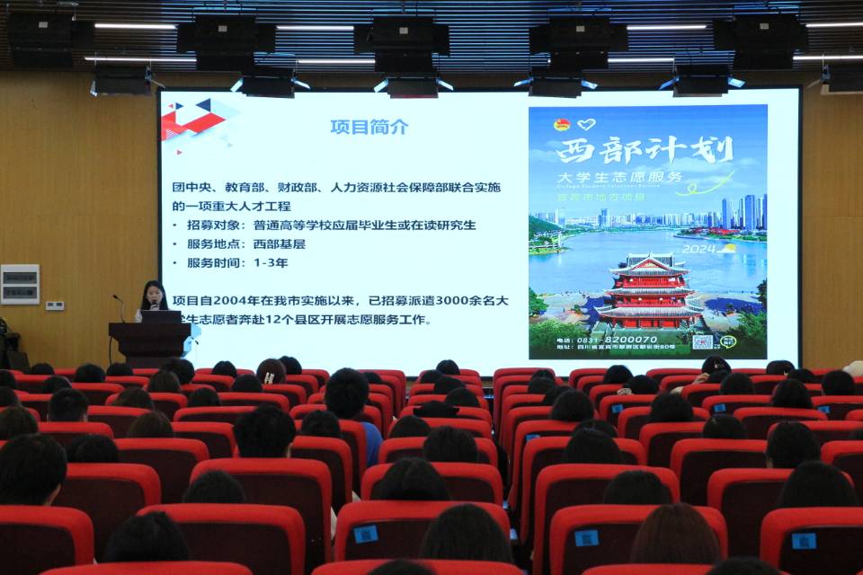 为号召更多应届毕业生投身基层,加入西部计划志愿者队伍,全力服务乡村振兴战略,5月10日下午,由共青团宜宾市委主办的“志愿西部行,建功新时代”2024年度西部计划宣讲会在宜宾学院临港校区会议室6101顺利举办。西部计划政策宣讲人冉心意担任宣讲嘉宾,宜宾学院270名应届毕业生代表参加。
