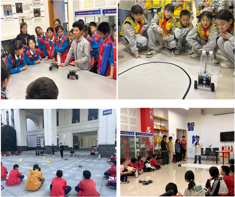 在电子信息工程学院实验与创新中心活动现场,学院教师和大学生向参加活动的中小学师生展示了近二十件大学生电子设计作品,包括荣获国家级、省级学科竞赛奖项作品如自制仿生蝴蝶、自制无人机、自制机械狗、独轮车、两轮平衡车、惯导四轮车、裸眼3D全息投影等,演示了独轮车防撞、两轮平衡车承载物品、断路赛道四轮车识别道路以及内外环赛道四轮车超车等作品功能展示,并深入浅出讲解作品的原理及制作过程。参加活动的中小学生参与积极性高,思维活跃,对本次活动以及展示的作品表现出浓厚兴趣,纷纷表示长大以后也要像大学生哥哥姐姐一样,独立设计制作各种科技作品,积极投身国家科研事业,勇攀科技高峰,并希望能多组织类似的活动,帮助他们在课外拓展知识。
