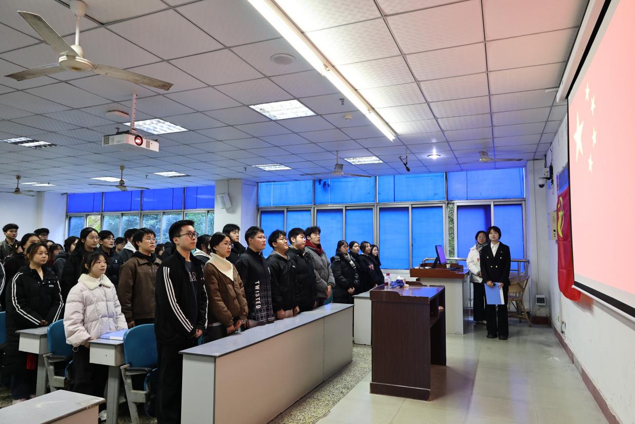 优秀党员代表向新团员颁发团徽和团员证书,新团员们郑重地接过了团徽,这枚小小的团徽承载着共青团的光荣传统与神圣使命。在团员代表邓雨露的带领下,新团员们举起右拳,面向团旗,庄严宣誓,要坚决拥护中国共产党的领导,遵守团的章程,履行团员义务,为共产主义事业而奋斗终身。铿锵有力的誓言在教室内回荡,展现了新团员们坚定的信念与决心。