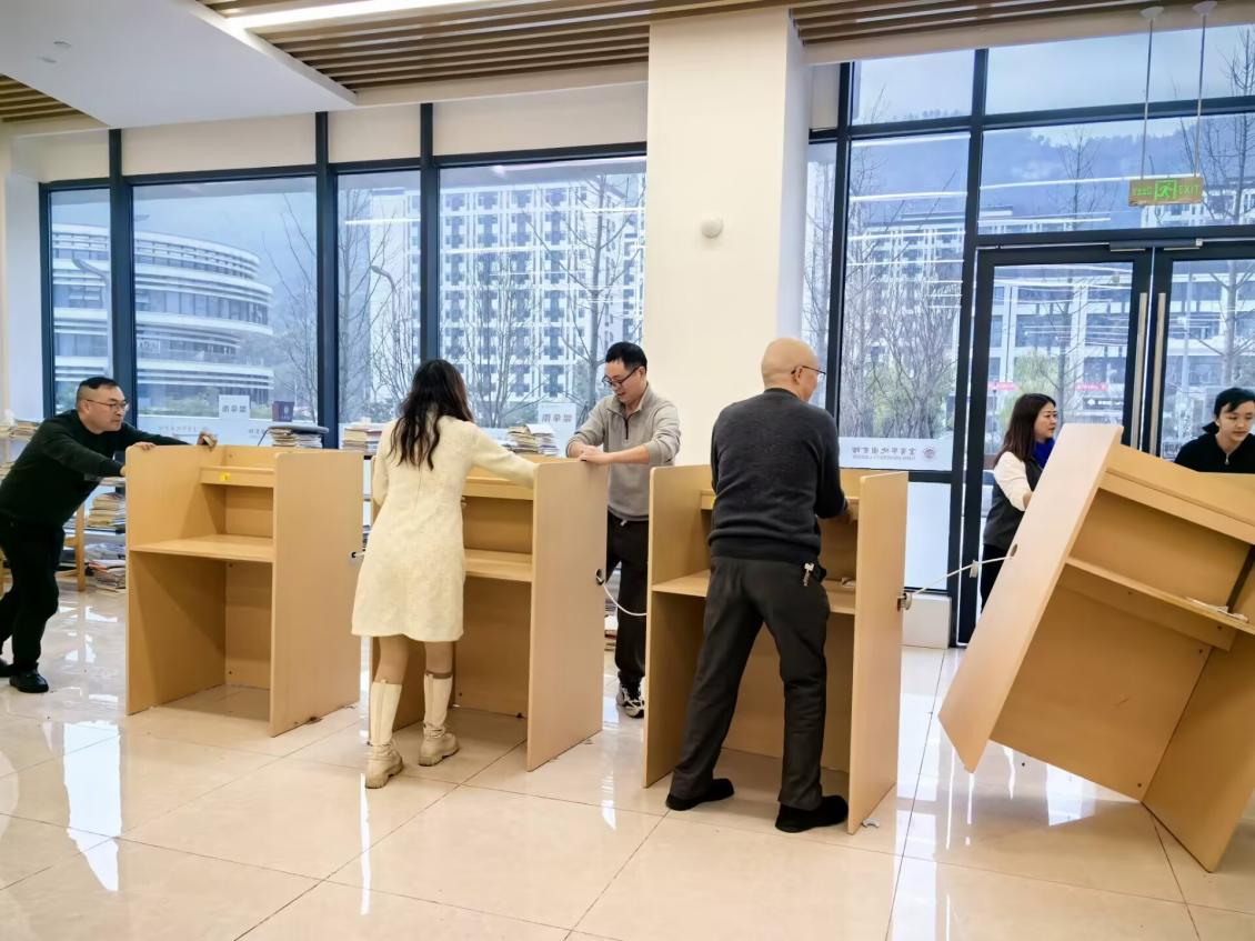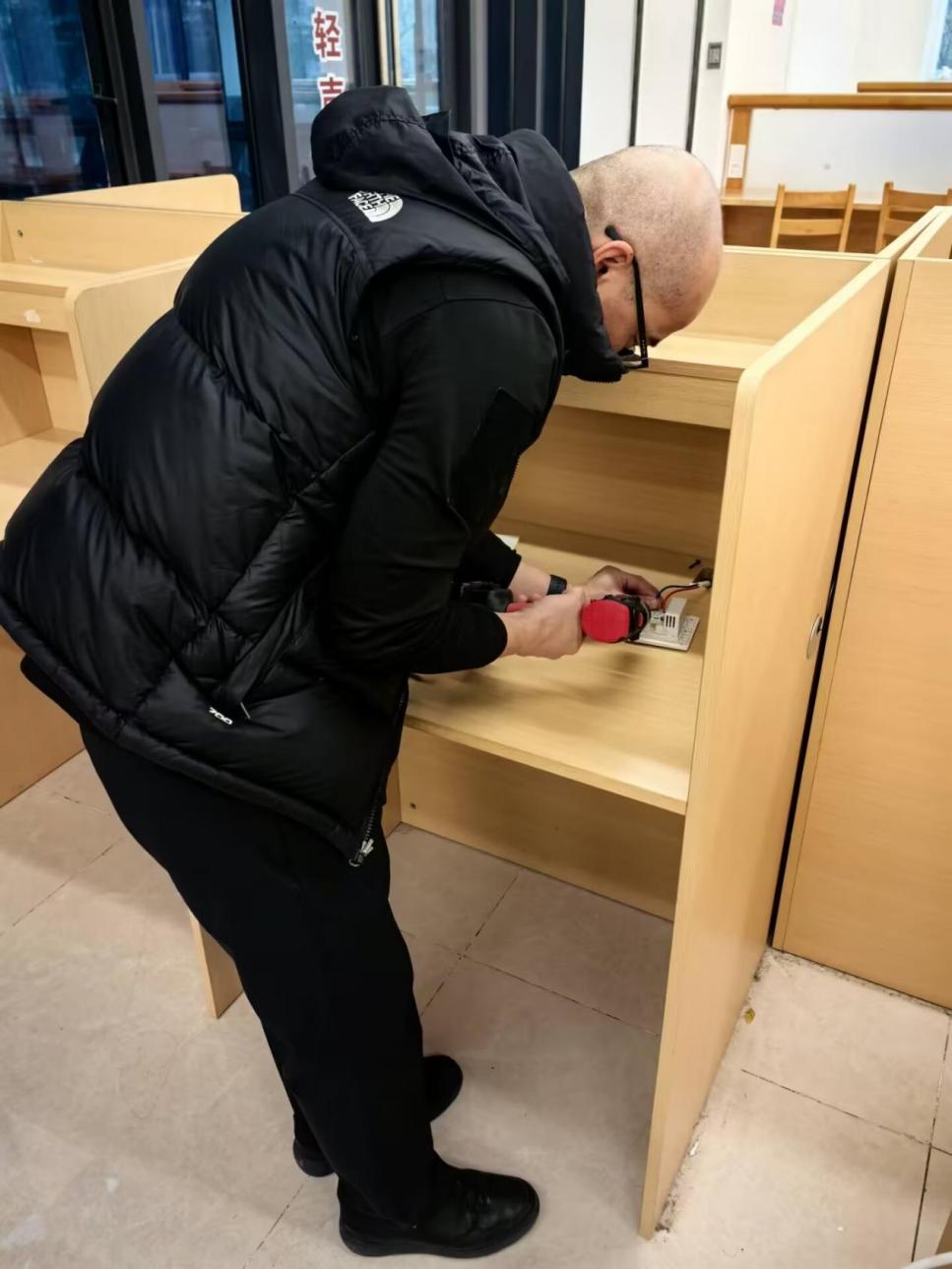 在馆长甘贤雪的带领下,图书馆老师们积极作为,抓住学生考研刚结束来馆时间减少的间隙,化身“搬运工”“电工师”,连续多天搬迁、改造、维修自习座位。经过数天辛勤劳动,图书馆从开放阅览区调整座位148席至自主学习空间,并对调整的座位进行了照明和电源通电。