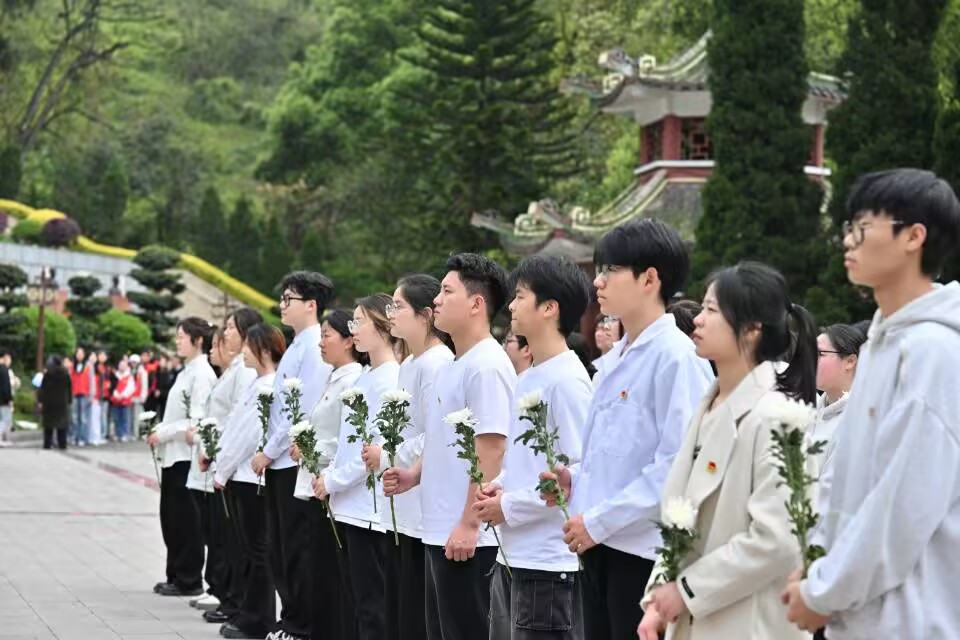 在引导员的指引下,学生代表稳步上前,敬献花圈。同学们依次上前献花,一束束鲜花承载着对先烈的深切追思。