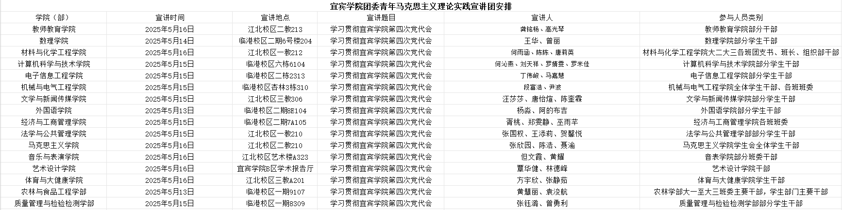 为深入学习领会宜宾学院第四次党代会精神,进一步加强青年学生团员对会议核心要义和精神实质的理解和把握,带动宣讲团自身建设取得新成效,近日,宜宾学院青年马克思主义宣讲团持续深入各个学院(部)一线进行系列专题宣讲活动。截至5月19日,共宣讲16场次,受众561名。
