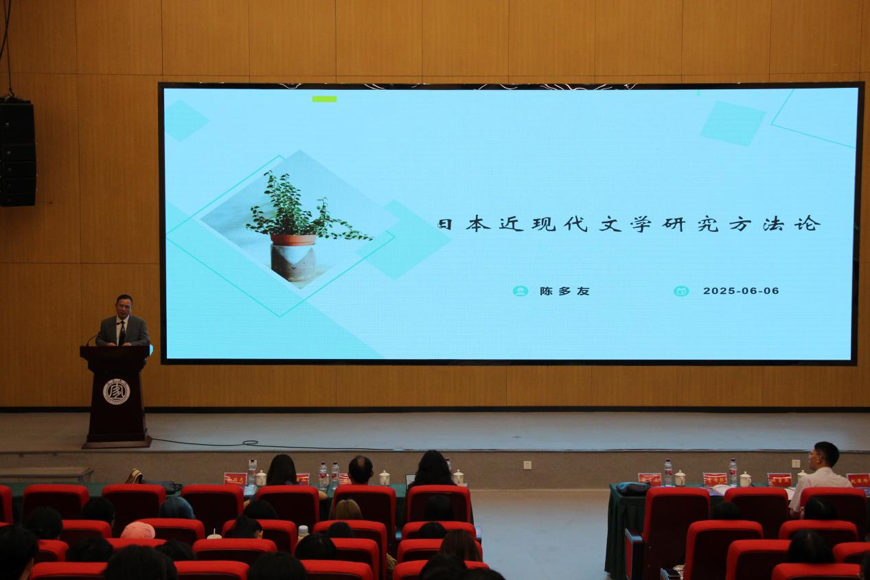 主旨报告环节,广东外语外贸大学日语语言文化学院名誉院长、博士生导师陈多友教授带来了题为《日本近现代文学研究方法论》的主旨报告。他在报告中为日本近现代文学研究提供了多维度、深层次的方法论视角,对日本近现代文学的历史脉络进行了宏观勾勒,详细阐述了文本分析法、历史文化研究法、比较研究法以及文学伦理学批评等研究方法,并通过具体案例分析进行阐释,为学术研究提供了坚实的理论框架及可行的实践指导。