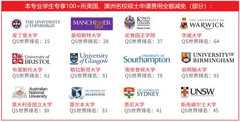 本专业学生还能专享包括曼彻斯特大学、爱丁堡大学在内的英国名校和悉尼大学、墨尔本大学在内的澳洲名校等100+所大学硕士申请费用全额减免,并提供全球名校定制申请服务支持,轻松实现名校留学梦想。