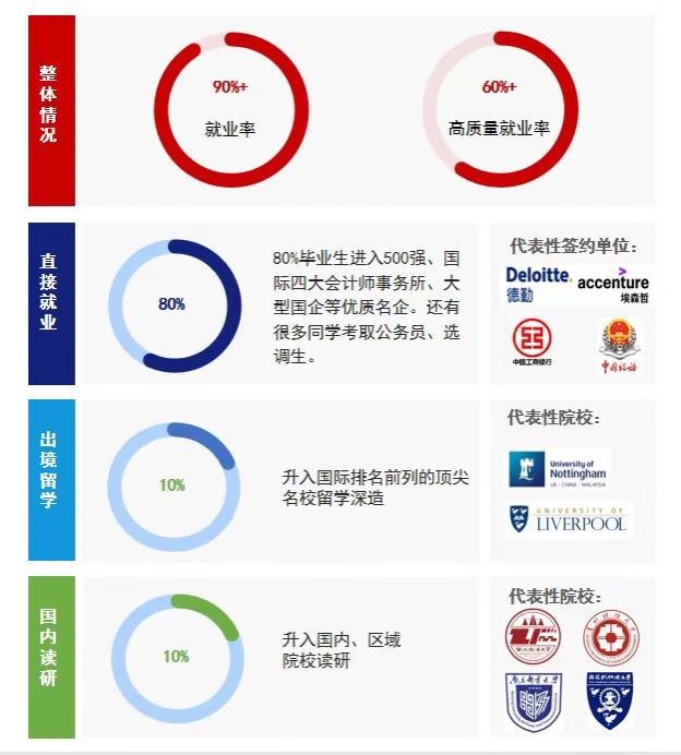 财务管理专业(ACCA方向)学生未来将拥有广阔的就业选择面,可在跨国公司、专业性会计师事务所、国企与金融机构等各类大型企事业单位从事财务、税务、商业分析、投融资、运营与管理等高薪职业。