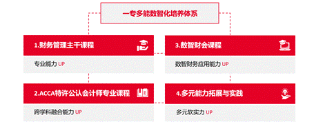 ACCA(英国特许公认会计师公会)自1904年成立以来,其与时俱进的课程体系被联合国作为全球会计教科书蓝本。财务管理ACCA深度对标国家数智化发展战略,聚焦人工智能与大数据广泛应用下财会专业学生的核心素养与技能,以当前全球大型企事业单位用人需求为导向,搭建起“财务管理核心课程筑基、ACCA全球认证课程拓界、数智财会课程赋能、多元能力拓展与实践”的一专多能数智化培养体系,课程内容聚焦会计、金融、财务管理、智能财务应用等学科交叉领域,旨在培养精通智能财务工具与国际化财经语言、系统掌握商业逻辑与全球视野的复合型数智财会人才。